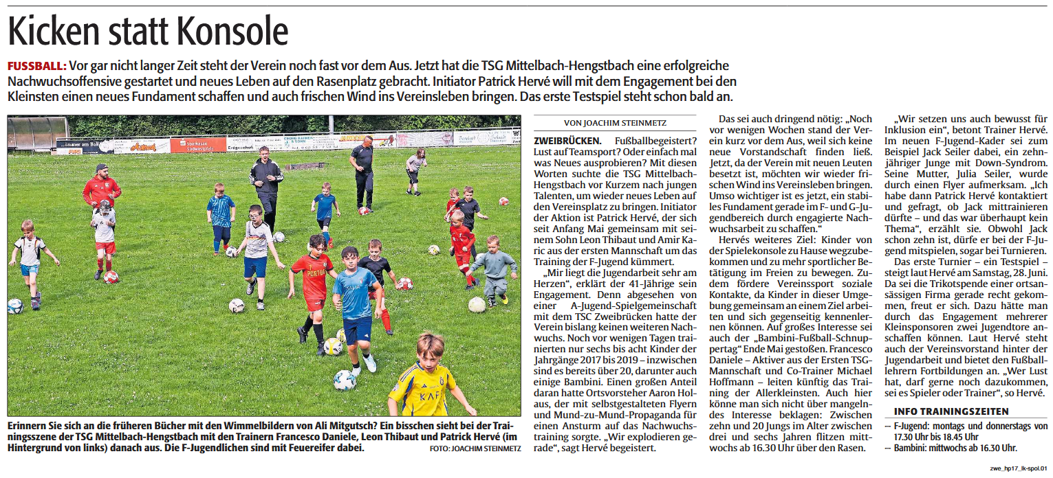 ein einfacher Staz, doch genau das ist die Motivation der Jugendtrainer der TSG Mittelbach-Hengstbach. Die Kinder von der Straße zu holen, ihnen eine Aufgabe zu geben, sie sportlich zu fördern, den Gemeinschaftssinn zu stärken und sozial zu integrieren. Die Rheinpfalz hat einen sehr schönen Artikel geschrieben, der die Situation beschreibt. Vielen Dank Herr Steinmetz!
